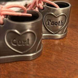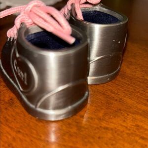 Adorable kids' keepsake shoes featuring a sleek silver finish and charming pink laces. Perfect for storing precious memories.