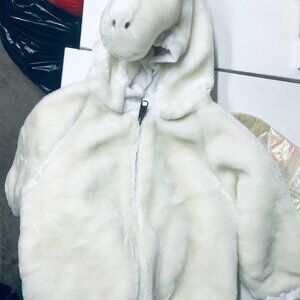 Soft plush white jacket with hood featuring unicorn head and silver horn, rainbow mane and tail, and iridescent wings.