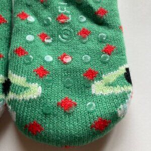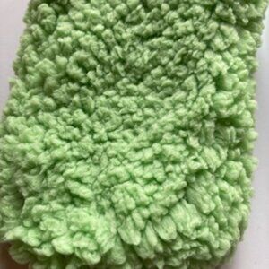 Fuzzy and soft Baby Yoda slippers. Material unknown but it's likely polyester. Approximately 8 inches from toe to heel unstretched and 4 inches across.