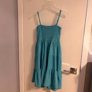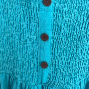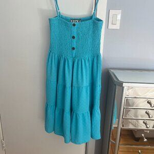 Lightweight baby blue summer dress with adjustable spaghetti straps has three buttons on the bodice.