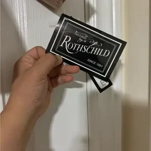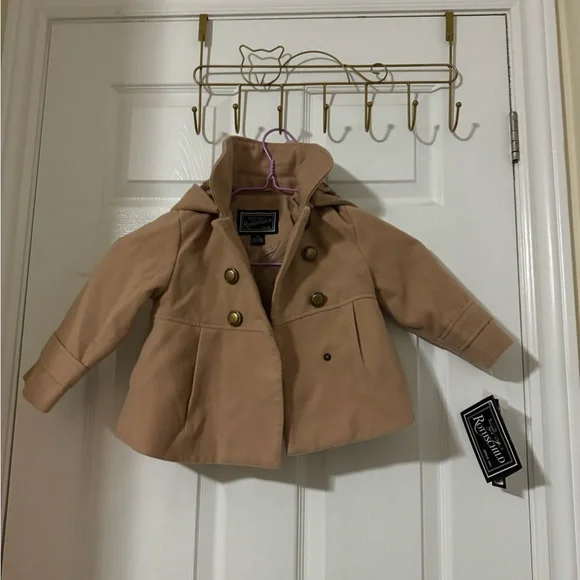 The image shows a children's beige peacoat with a double-breasted design, featuring gold-tone buttons for a classic and elegant touch. The coat has a wide, structured collar that can be worn standing up for added style. It also has a flared waist, creating a polished and tailored look. The sleeves are long with additional button details near the cuffs. This stylish coat is made by Rothschild, a well-known brand for children's outerwear, and it is a versatile piece suitable for cool weather, combining warmth with a sophisticated appearance. The attached tag indicates that the coat is brand new.