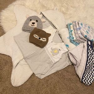 This gift bundle comes with two brand new knit animal winter tukes cotton lined (bear and owl), a night zip up sleeping suit (elephant) one muslin blanket (whales) two towels with hoods, one thick and one light. Five receiving blankets and one Sherpa hooded wrap onesie for winter. Great gift bundle for the holidays or for your very own little cutie pie. Some items have never been used and some have been used lightly. All in excellent condition.