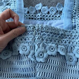 The dress features a soft, powder blue lace overlay with intricate floral embroidery throughout. The bodice has wide straps and a crochet-like texture, offering a semi-sheer look. The black waistband contrasts beautifully, accentuating the waist. The bottom of the dress includes a sheer tulle-like layer that adds volume and a feminine touch. The floral patterns are detailed and give the dress a vintage and romantic feel. It’s ideal for a summer or spring occasion, blending elegance with a playful vibe.