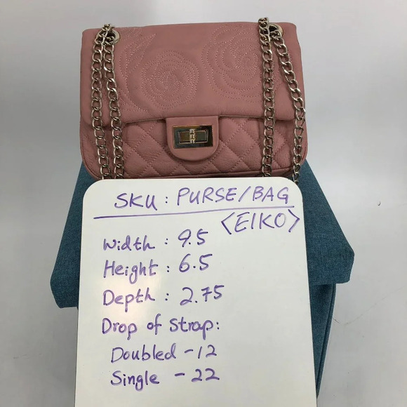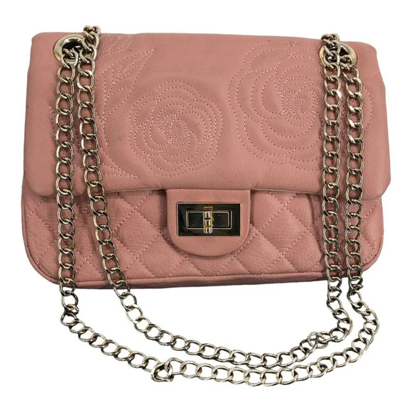 Cute quilted purse with rose floral stitching. Interior has two zip compartments. Twist lock mechanism. Double gold toned chained strap.