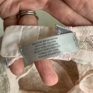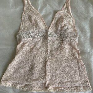 This is a great quality, vintage lace lingerie top with hook closure in back. Extremely flattering and sexy. Colour is a very light baby pink. Made of 100% cotton with Spaghetti straps. Sexy cutout in the back.