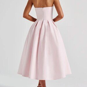 The Edith Midi Dress in Blush is the epitome of elegance, designed to make a statement at any occasion. This strapless beauty features structured boning in the bodice, offering a flattering and supportive fit. The full skirt, crafted with inverted box pleats at the waist, creates a stunning silhouette that moves gracefully with every step. Whether you're attending a wedding, birthday, or special event, this dress combines timeless style with modern sophistication.