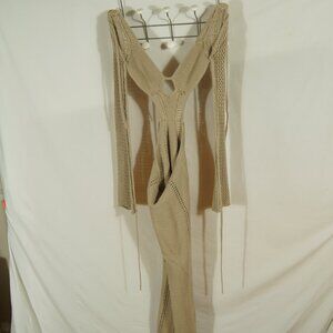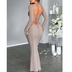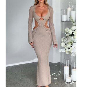 🤎✨ BABY BOO FASHION Beige Crochet Long Sleeve Maxi Dress ✨🤎 Stunning boho-chic piece perfect for festivals, beach vacations, or trendy nights out! Details: Brand: Baby Boo Fashion Color: Beige/tan/nude Style: Long sleeve crochet maxi dress Open knit/crochet construction throughout Deep plunging V-neckline with tie details Long sleeves with open knit pattern Maxi length - flows beautifully Body-skimming fit Unlined - perfect for layering or as coverup Stretch crochet fabric