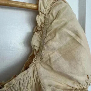 Rouged neckline that can go up or down around shoulders. Also rouged around the arms.