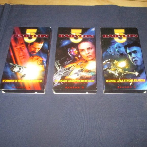 This is 1997 VHS Triple video cassette bundle: Babylon 5 Season 5 Volume 5.2: with episodes: No Compromises & The Very Long Night of London Molari, and Volume 5.3: with episodes: The Paragon of Animals & A View From The Gallery; & Volume 5.4: with episodes: Learning Curve & Strange Relations, They all are in decent condition with very little wearing on the slipcase. They were watched and had no noticeable issues with them. They also come with 4 collectible promo cards as well. This bundle is sold as is.