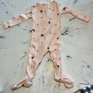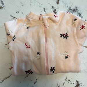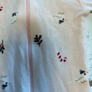 Baby’s 1st Christmas Sleeper, Little Earthling 6-9 months. Excellent condition. Looks like it was never worn. Light pink with little birds wearing toques, holly berry leaves, candy canes and wrapped gifts. Super cute for Christmas or the whole winter season.