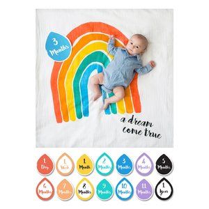 Turn milestones into memories with this large super soft premium quality photo blanket and milestone cards set. Perfect for the modern day social mom, this ready-to-use coordinating backdrop with milestone cards easily captures baby's first months. Perfect baby shower gift and makes for adorable social media posts! Includes: 1 large muslin blanket + 7 double-sided cards with 14 milestones.