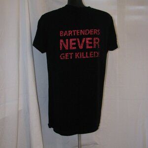 Bacardi Black T-shirt with Bat logo on front & "Bartenders never get killed" on back