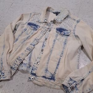Baccini | Off white blue acid wash rhinestone button up jean jacket