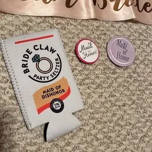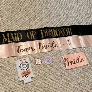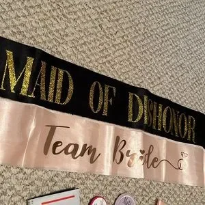 3 sashes - one that says “maid of dishonour” and two that say “team bride”.