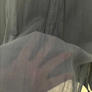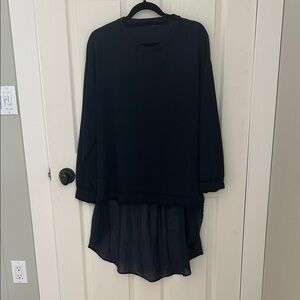 From the front it looks like a sweatshirt, but a high end one with nice details and finishing. Then turn around and voila! - a sheer panel that drops down to a longer length. It’s quite a dramatic piece and looks great with denim. Think rolled up jeans and ankle boots. The colour is marine. This is from Italian designer Baci. The size small is extremely generous - see images for measurements.