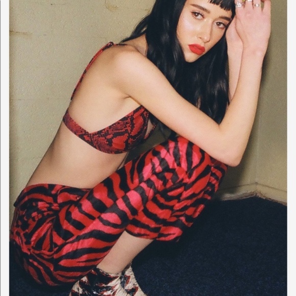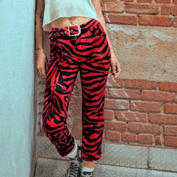 Handmade mid-rise pants are designed with a cigarette-style cropped leg fit using super soft & lightweight red zebra faux fur velvet.