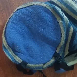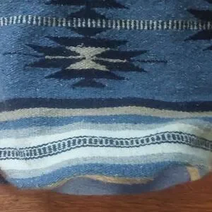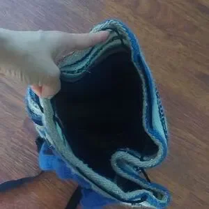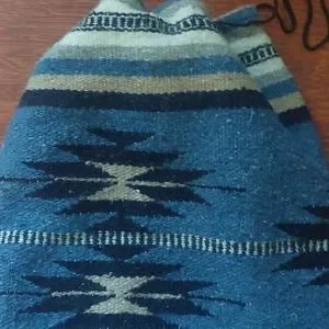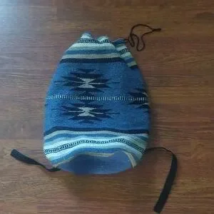 slouchy blue, tan and cream Aztec print backpack with drawstring closure and round base