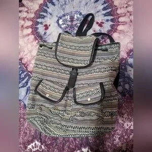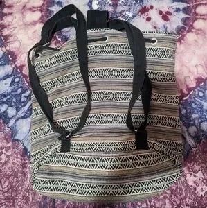 Fabric backpack with adjustable straps and mouth. inside has two open pockets and one zipper pockets. outside have two pockets with magnetic clasp.