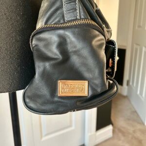 This Badgley Mischka black genuine leather purse has gold hardware and white stitching. The dimensions are Length- 15.5” Width- 4.5” Height- 8”. This purse is a rectangular shape. The front of the bag has 2 pockets that fasten with gold buckles. Behind the front pockets is a zipper enclosed compartment. Both ends of this purse have 2 pockets with a zipper enclosure. The top zipper opens to the large and spacious interior of this purse. Inside the bag there is a multi-pocket section for the essential items you do not want to fall into the bottom. There is a thin pocket on the opposite side that has a zipper. The top of the purse has 2 handles to carry the purse. There is also a long strap, 40”, that can be clipped onto the purse if you prefer to carry it on your shoulder. This purse is gently used. The gold hardware has some scratches. It is a beautiful bag with a lot of room to carry everything you need.