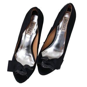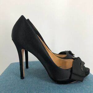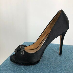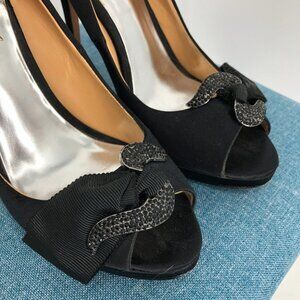 Badgley Mischka Black Satin Peep-Toe Crystal Serpent Bow High Heels size 7.5