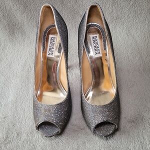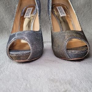 Badgley Mischka Humbie IV Gold Pewter peep toe heels size 7.5