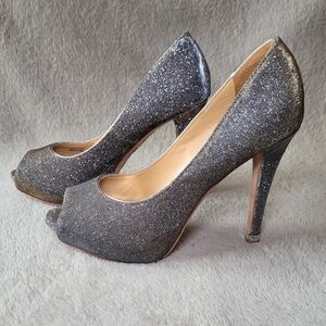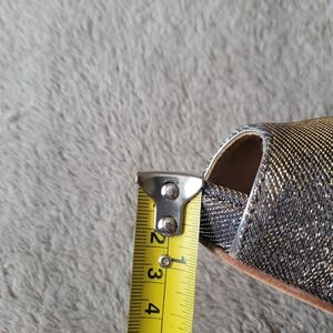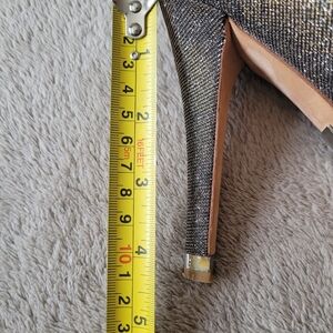 High heel peep toe shoes, mixture of gold and pewter depending on how the light hits it. In very good used condition, wear on the soles and a mark on one heel tip.