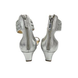 Step out in style with the elegant Badgley Mischka Sandal. These silver sandals feature a stunning diamond and pearl design, perfect for any special occasion. Available at our consignment shop.