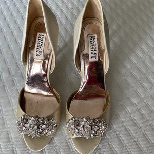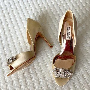 Exquisite Badgley Mischka Satin Heels with Crystal Embellishment Sz 8 EUC 5" Heel. Featuring gold-tone insole, crystal embellishment, pointed toe, high heel, cut out sides and slip-in style. These shoes are beyond incredible.