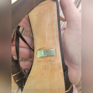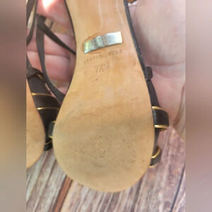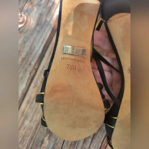 Badgley Mischka Shoes Black Gold Satin Sandal Womens Strappy High Heels Size 7.5