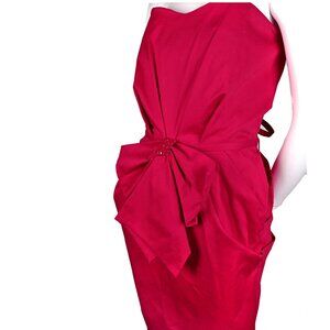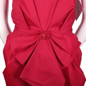 Short strapless dress with sweetheart neckline and light boning around bust. Gathered front with large accent bow at waist and pleated around hip and back. Thin tie wraps around waist and ties at back. Back zipper. Beautiful red mini perfect for date night!