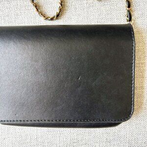 Small black compact bag with shoulder strap / crossbody strap. Measurements in photos. Has markings on the front, and a small indent on the back. Please examine photos carefully for condition.
