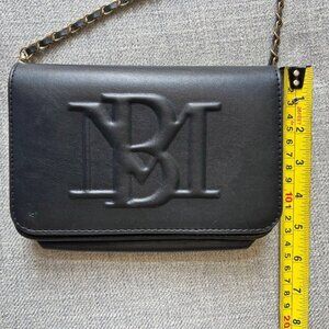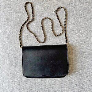 Small black compact bag with shoulder strap / crossbody strap. Measurements in photos. Has markings on the front, and a small indent on the back. Please examine photos carefully for condition.