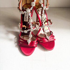 Badgley Mischka coral red satin rhinestone cocktail heels shoes 5.5