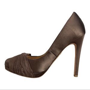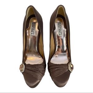 Pump and platform combine with a ribbon of ruching and custom crystal detail in the Badgley Mischka Odell pump.