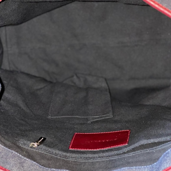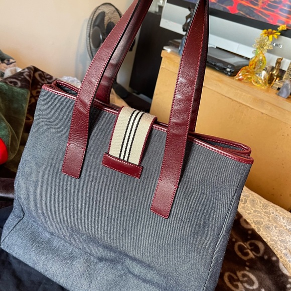 Semi-rigid denim bag with burgundy leather handles and fabric button. Metal feet.