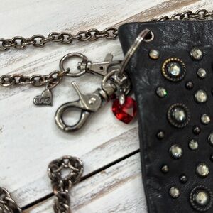 Bag crossbody , genuine leather with all the hooks and hearts will fit an iPhone plus no problem inside this is super cute. Great quality.