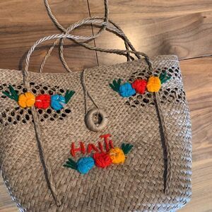 Beach, travel or shopping bag in natural fibres, either straw, raffia or rattan. Natural colour perked up with bright embroidered flowers and word "Haiti" also in same dyed natural fibre. Long braided fibre handles for shoulder wear, loop and button closure. Unlined in excellent used condition with no damage wear or stains detected. Cute for beach, pool, resort use or go to the market in style. Fun international boho vibe. Add some completing pieces from Our Closet (some suggestions shown all listed and priced separately), design a whole new look, and save! Fun and flirty fashion just for you from Lemon Squeezy Shop 🍋