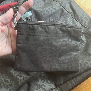 Chic Baggallini backpack with a dark brown leopard pattern and red interior. Features a front zip pocket, top flap closure, drawstring for interior bag, components for credit cards, phone, and tablets, and separate zippered pouch. Straps are adjustable.