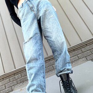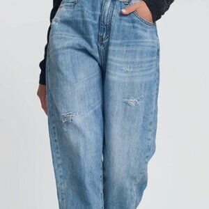 Baggy balloon denim jeans in a light-med wash, with high waist, ripped details, front and back pockets and zipper fly. *The chain belt not included.