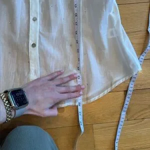 Absolutely stunning lightweight blouse with subtle scattered rhinestones that catch the light beautifully. Features iridescent buttons, a round neckline, and soft billowy sleeves for that effortless, elevated look.