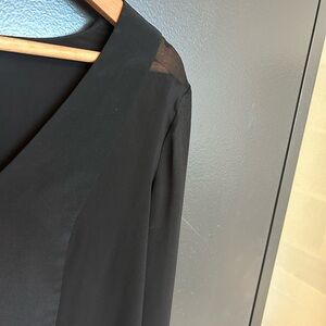 Bailey 44 blouse size S beautiful sheer, bottom loose with slit, very flowing sleeves- unfortunately fabric label is gone- I believe it’s at least partially silk- but can’t confirm! Beautiful blouse