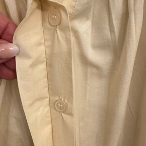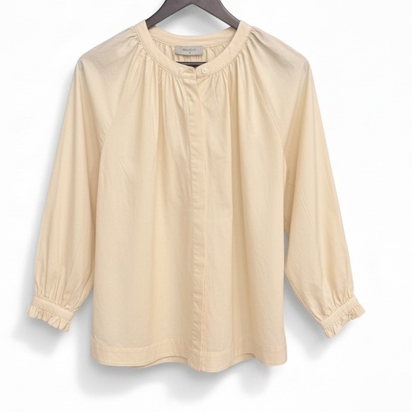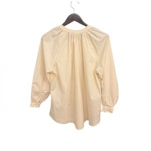 Chic cream blouse with button-up front. Features gathered sleeves and relaxed fit. Perfect for casual or dressy occasions.