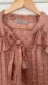 Gorgeous rust pink blouse with delicate pleating and a subtle floral print with copper threading throughout. Features a flattering V-neck with a tie-front bow and pretty ruffle detail across the chest and shoulders. Lightweight and flowy with long sleeves and elastic cuffs — perfect for dressing up or down. A must-have for any boho or vintage-inspired wardrobe!