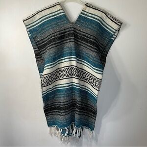Mexican blanket poncho, cotton knit Baja wrap or shawl type sweater. Blue, black, white, grey striped, with fringe