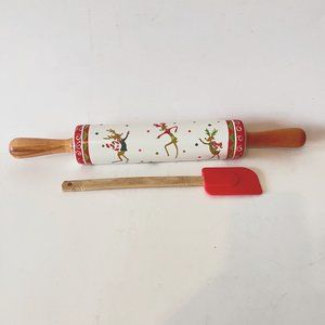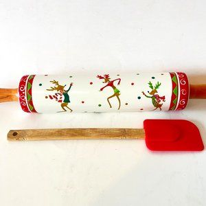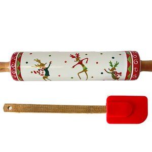 Festive high gloss ceramic rolling pin with red and green hand painted dancing Christmas reindeer with wooden handles. Rolls smoothly and is in excellent condition.Iit has a one minor mark on each wooden handle due to handling. Lovely functional and decoration for your kitchen.