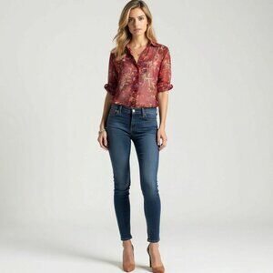 The fabric is a beautiful 100% silk sheer fabric, giving it a delicate and luxurious feel. It is fully lined with a blend of 72% acetate and 28% silk, ensuring a smooth and comfortable fit. This blouse is perfect for layering and can be styled with a camisole underneath for a sophisticated, semi-sheer look.