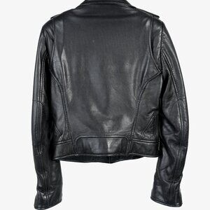 Circa 2010, this moto jacket from Balenciaga is crafted in a soft black lambskin leather, and features long sleeves, zip cuffs, decorative shoulder epaulettes, a collared neckline, an offset front zip closure, front zip pockets, a cropped hem, and is lined in a tonal satin.