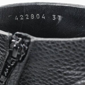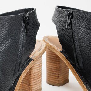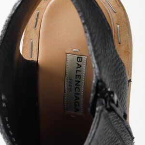 These sandals from Balenciaga are crafted in a black pebbled leather, and feature stacked block mid-heels, rounded peep toes, a slingback strap, inner side zip closures, and leather soles.