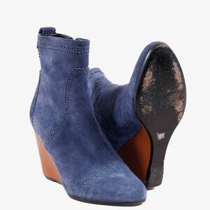 Western-inspired blue suede ankle boots from Balenciaga featuring a round-toe, a brown leather wedge heel, a blue suede upper with decorative eyelets, a pull-tab at the back, a zip-closure at the side, and a black leather interior.