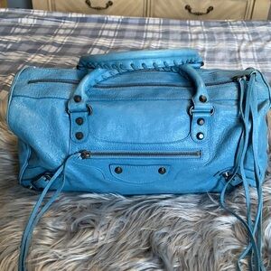 Stylish Balenciaga shoulder bag. Vibrant blue color. Includes adjustable strap and signature hardware.